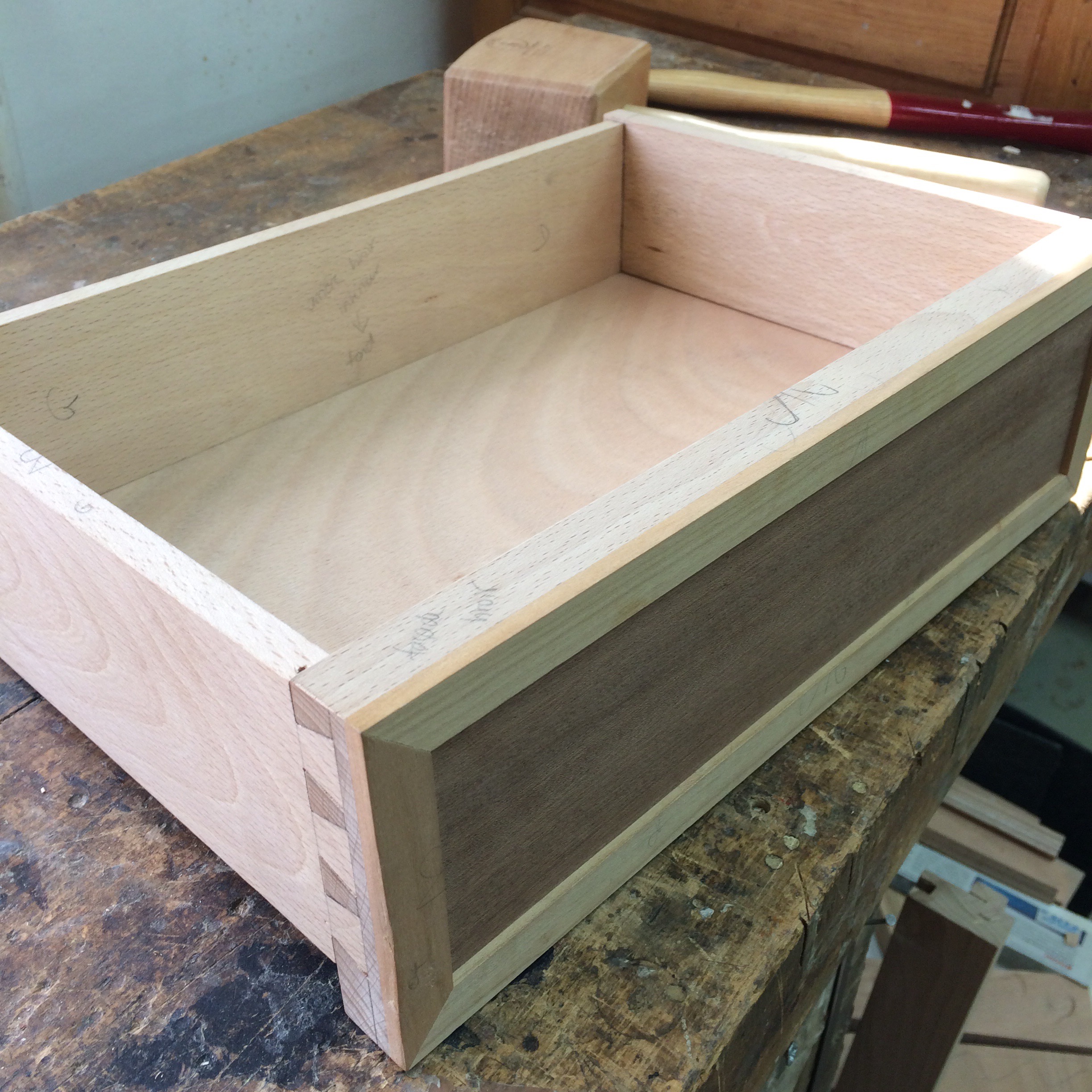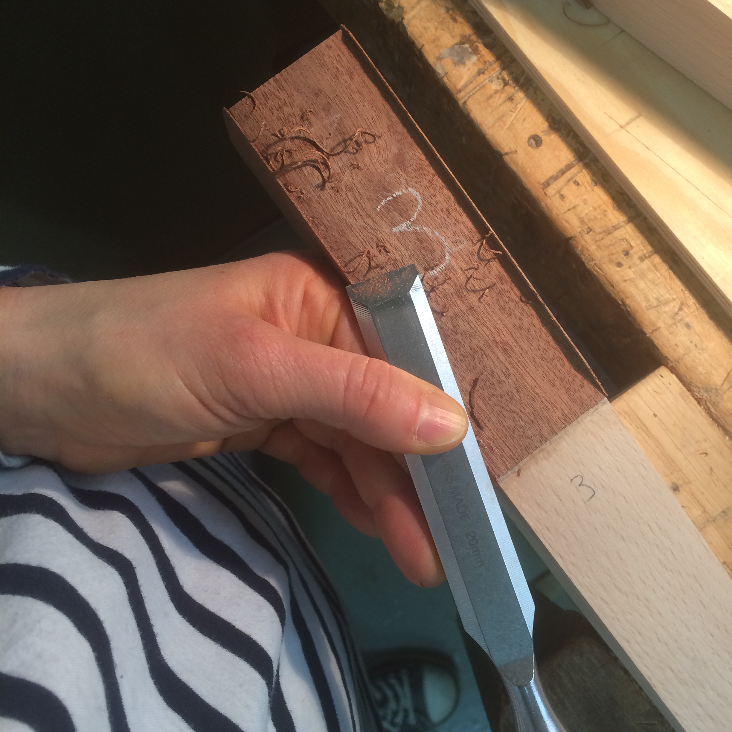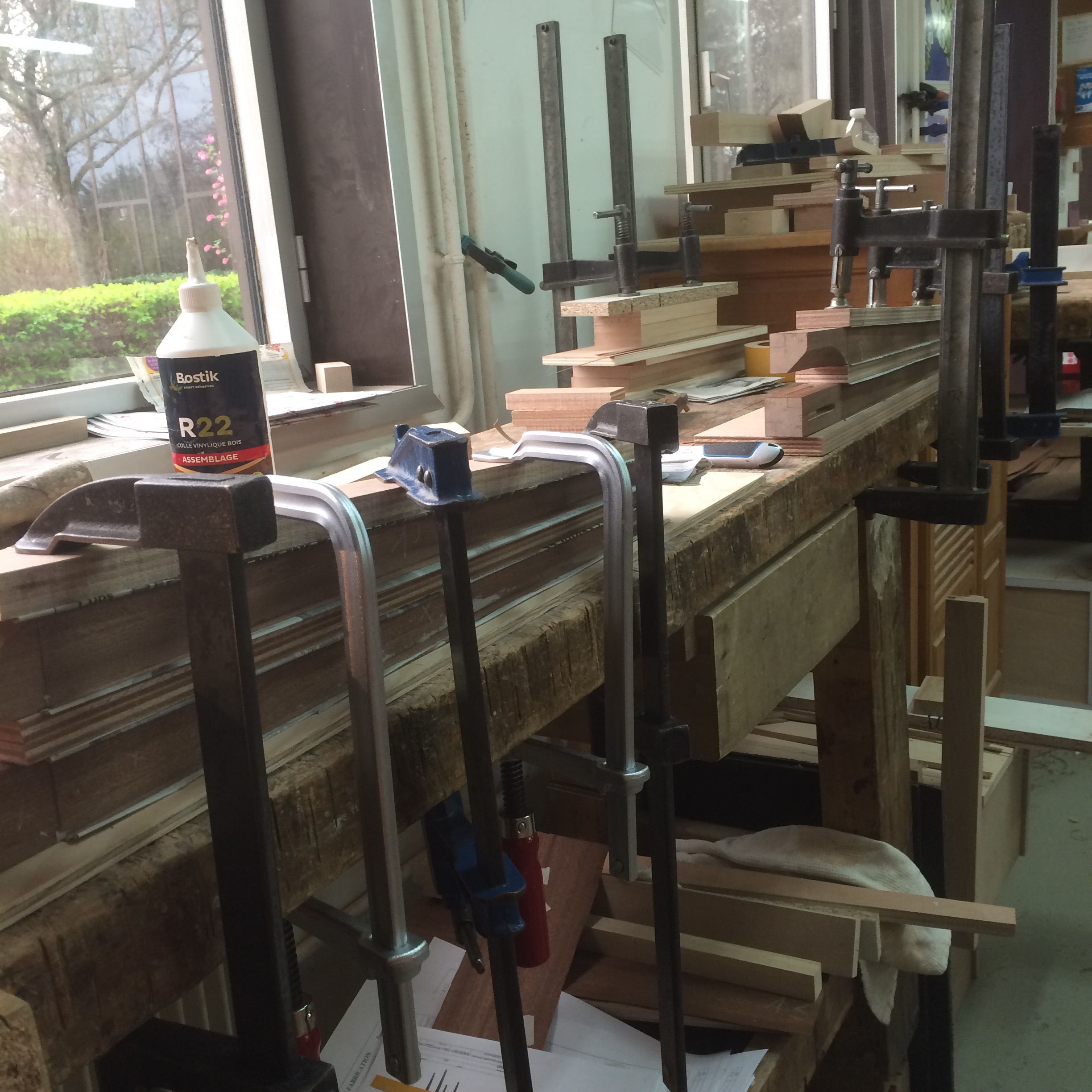 La journée s’est terminée en apothéose. J’avais mal au dos depuis ce matin, j’ai voulu m’étirer en me tenant à l’établi vacant sur lequel j’avais posé les côtés et pieds entièrement plaqués du chevet Louis XVI sur lequel je travaille depuis des semaines… L’établi est tombé. Il semble qu’il ait été mal réhaussé et sans fixations.
